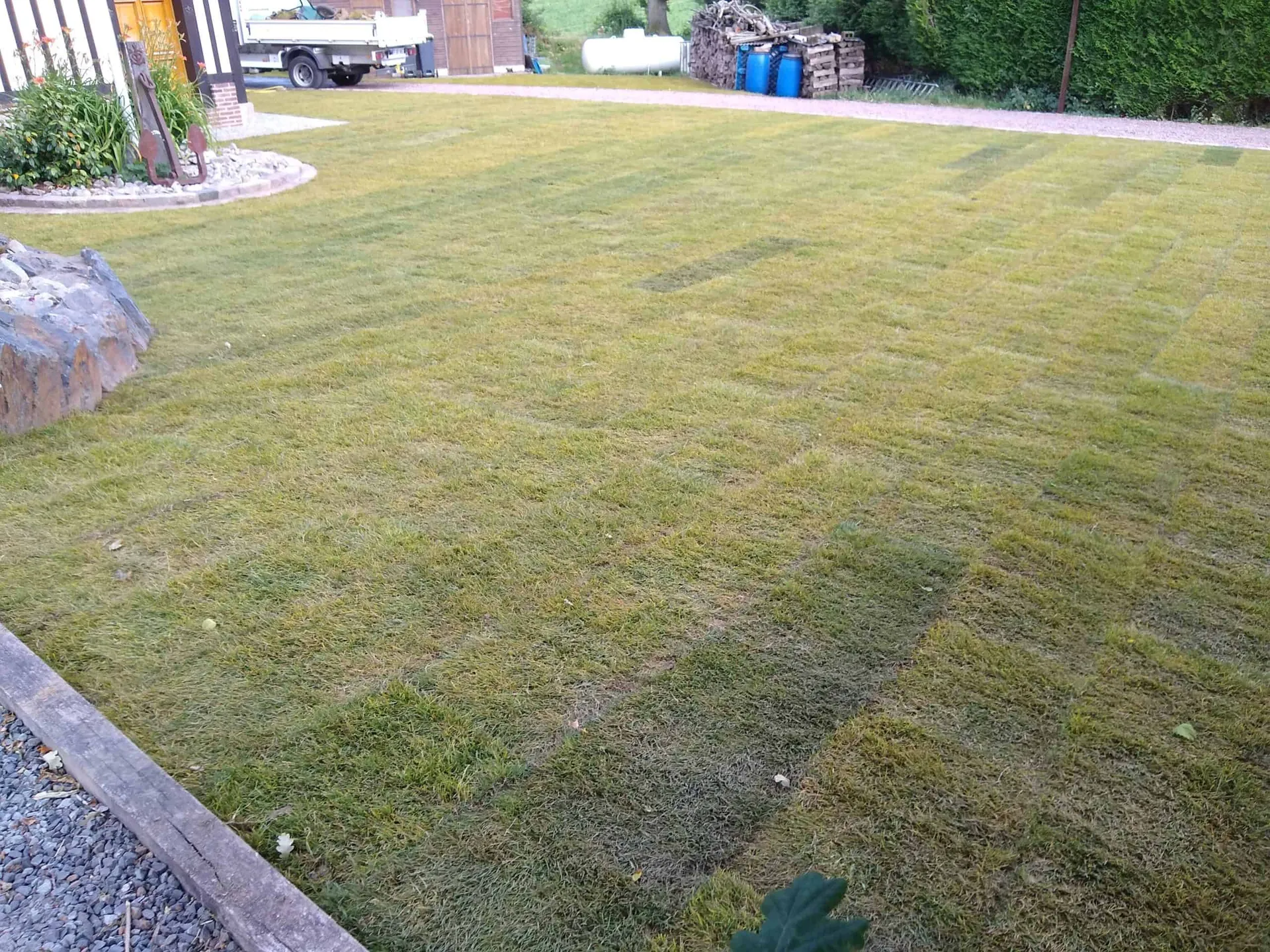 Une première tonte a été réalisée afin de densifier le gazon et favoriser son enracinement. Le roulage permet quant à lui d’assurer un bon contact entre les plaques de gazon et le sol, garantissant ainsi une pelouse stable et durable.