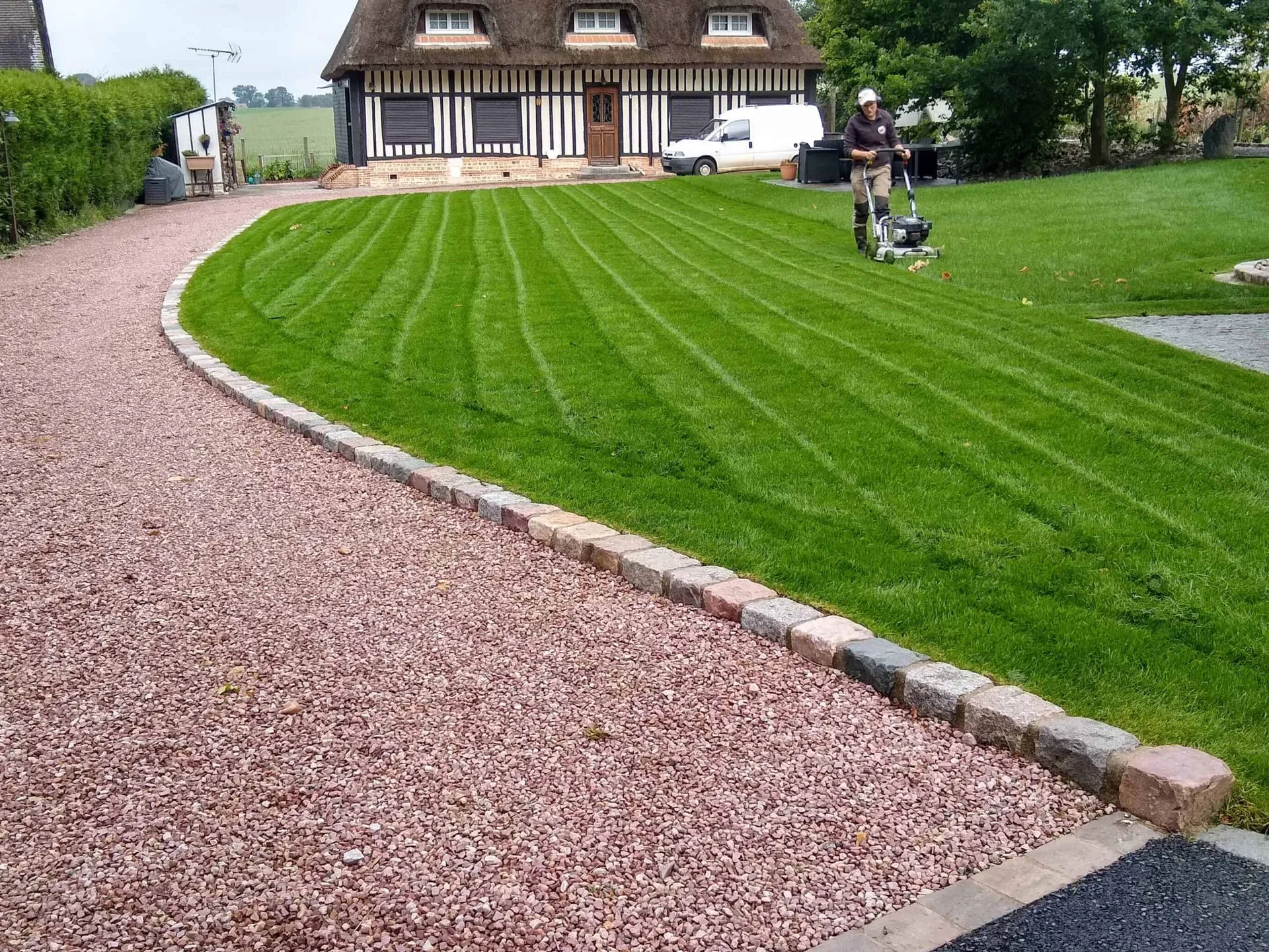 Cette réalisation à Manneville-la-Goupil démontre l’expertise des Jardins d’Augustin dans la création de pelouses haut de gamme, adaptées aux particuliers souhaitant un extérieur esthétique et facile d’entretien en Normandie.